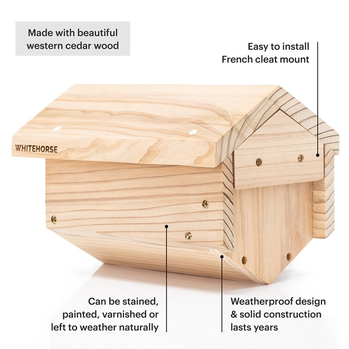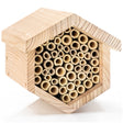 A large roof overhang keeps the tubes shaded and dry; A 0.5" gap in front of the tubes further protects them from rain; Dado joint-construction in the back keeps the bee box dry and less drafty. Features 55 bamboo tubes that can house 275 bees, enough to pollinate a medium-sized home garden. Included: mounting cleat and screws, detailed installation tips, and our popular guide on how to successfully attract and keep mason bees and other solitary species. Made from western cedar and naturally weather-resistant. 8-3/4 x 3-3/4 x 5-1/4 inches.