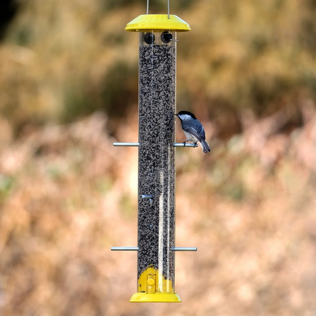 - Easy Clean tube feeder with seed openings both above and below the six perches