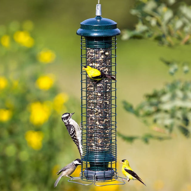 The squirrel’s weight triggers the closing mechanism. Weight-activated ports close off seed to squirrels and larger birds. Detachable base works as a funnel to allow for refilling without spilling. Easily dismantle the feeder and clear plastic tube for cleaning. Includes Manufacturer's Lifetime Care Guarantee. Durable metal with powder coated green finish. Feeder measures 5.3 x 24.5 inches tall.