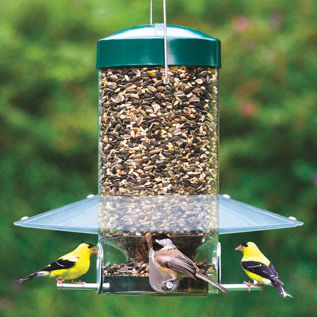 The clear, two-piece baffle is situated low—right over the four feeding ports to shelter your birds from rain, wind and snow. Squirrels can’t grasp the slick plastic tube or reach around the baffle, great for reducing waste. Enamel-coated green metal top with 6 inch diameter, remove for filling. Clear plastic baffle measures 16 inches wide. 12 inches tall.