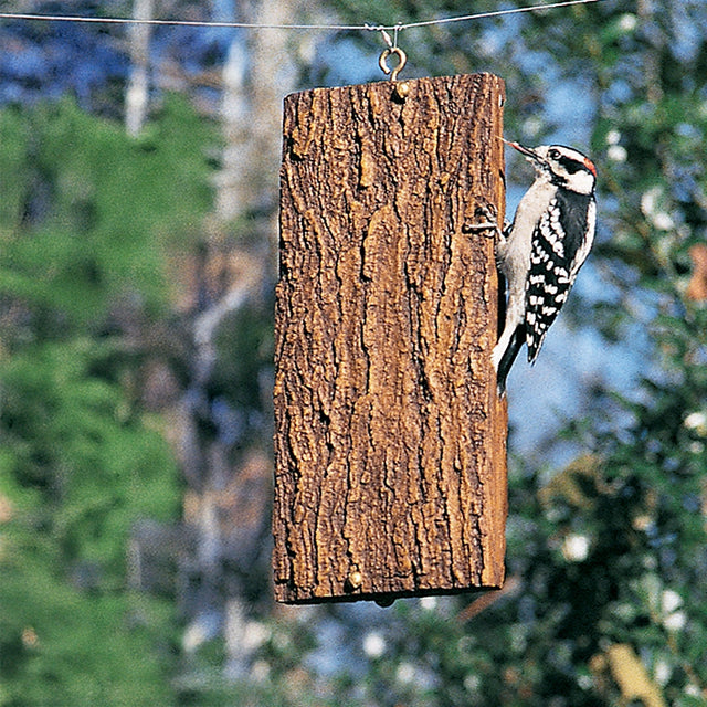 Pull apart the two outer "bark" pieces and fill this BirdsChoice feeder with spreadable suet or a homemade peanut butter mix. A woodpeckers' long tongue can reach the food--but starlings and grackles can't.