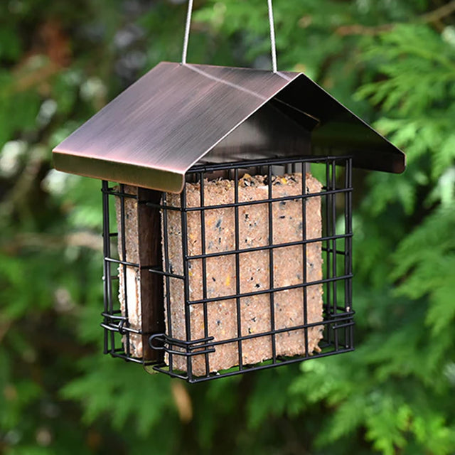 Birds love the high energy suet and being weather protected. The Regal Style Double Suet Cake Feeder is a modern copper colored design. This attractive feeder can hold 2 suet cakes, is easily fillable, and the covered roof helps to keep the suet fresh! The Regal Style Double Suet Cake Feeder dimensions are 5-1/4 x 6-1/4 x 11-1/2 inches.